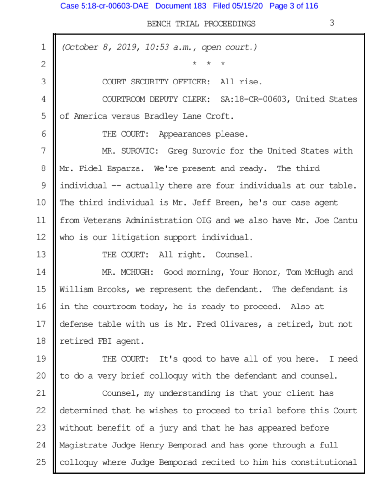 Exhibit F — Bench trial proceedings transcript, October 8, 2019 (public court record).