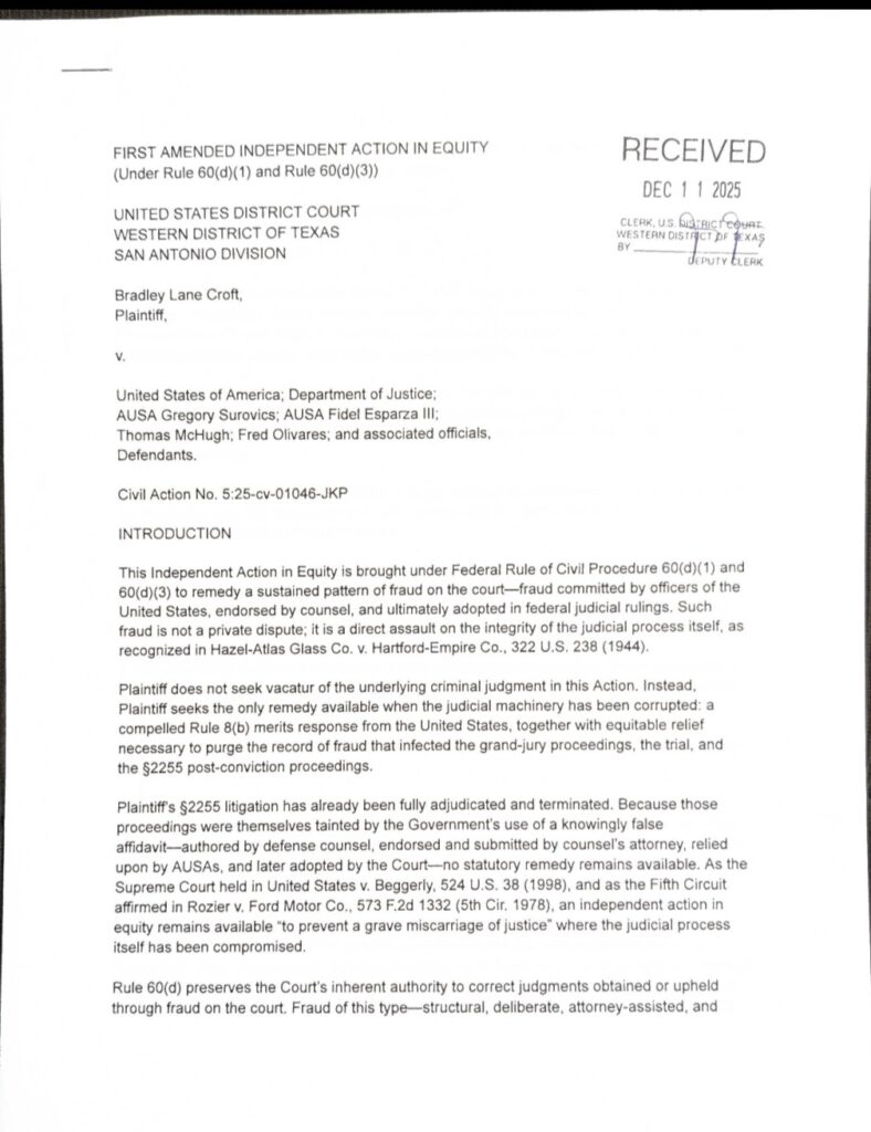 On December 11, 2025, a First Amended Independent Action in Equity was filed in the United States District Court for the Western District of Texas, San Antonio Division.